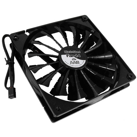 AAB Cooling Black Silent Fan 14 to wysokiej klasy wentylator o rozmiarze 14 cm w którym zastosowano, aż 15 łopatek wentylatora. Pozwala to na znaczne zwiększenie wydajności (wzrost o ok 65%) oraz minimalizację hałasu.Specjalnie wyprofilowane łopatki niwelują hałas, a wentylator charakteryzuje się wysoką jakością wykonania, wydajną pracą oraz korzystną ceną. W komplecie znajdują się także odpowiedzialne za redukcję drgań silikonowe podkładki pod śrubki. Wysokiej jakości silnik został wyposażony w nowoczesny układ IC zapewniający stabilną pracę wentylatora, a nowoczesne łożysko FDB (Fluid Dynamic Bearnig) z wypełnieniem olejowym gwarantuje cichą pracę oraz wydłużoną żywotność aż do 100000 h. Wentylator pracuje ze stałą ilością obrotów 1000±10%. Przepływ powietrza to aż 104 m3/h, a poziom hałasu generowany przez śmigła kształtuje się w granicy 18,6 dB, co czyni go cichym i bardzo wydajnym wentylatorem w swojej klasie dostępnym na rynku. Montaż jest bardzo prosty - za pomocą 4 wkrętów montujemy wentylator w odpowiednim dla nas miejscu. Dodatkowa zaletą jest możliwość montażu 2 wentylatorów, jednego z przodu obudowy, drugiego z tył, co zapewni bardzo dobry przepływ powietrza.
