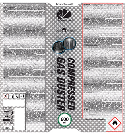 Produkt jest mieszaniną gazów pod wysokim ciśnieniem. Służy do usuwania kurzu i innych luźnych zanieczyszczeń ze sprzętu komputerowego, RTV, AGD i innych urządzeń. Nie wstrząsać pojemnikiem bezpośrednio przed użyciem.